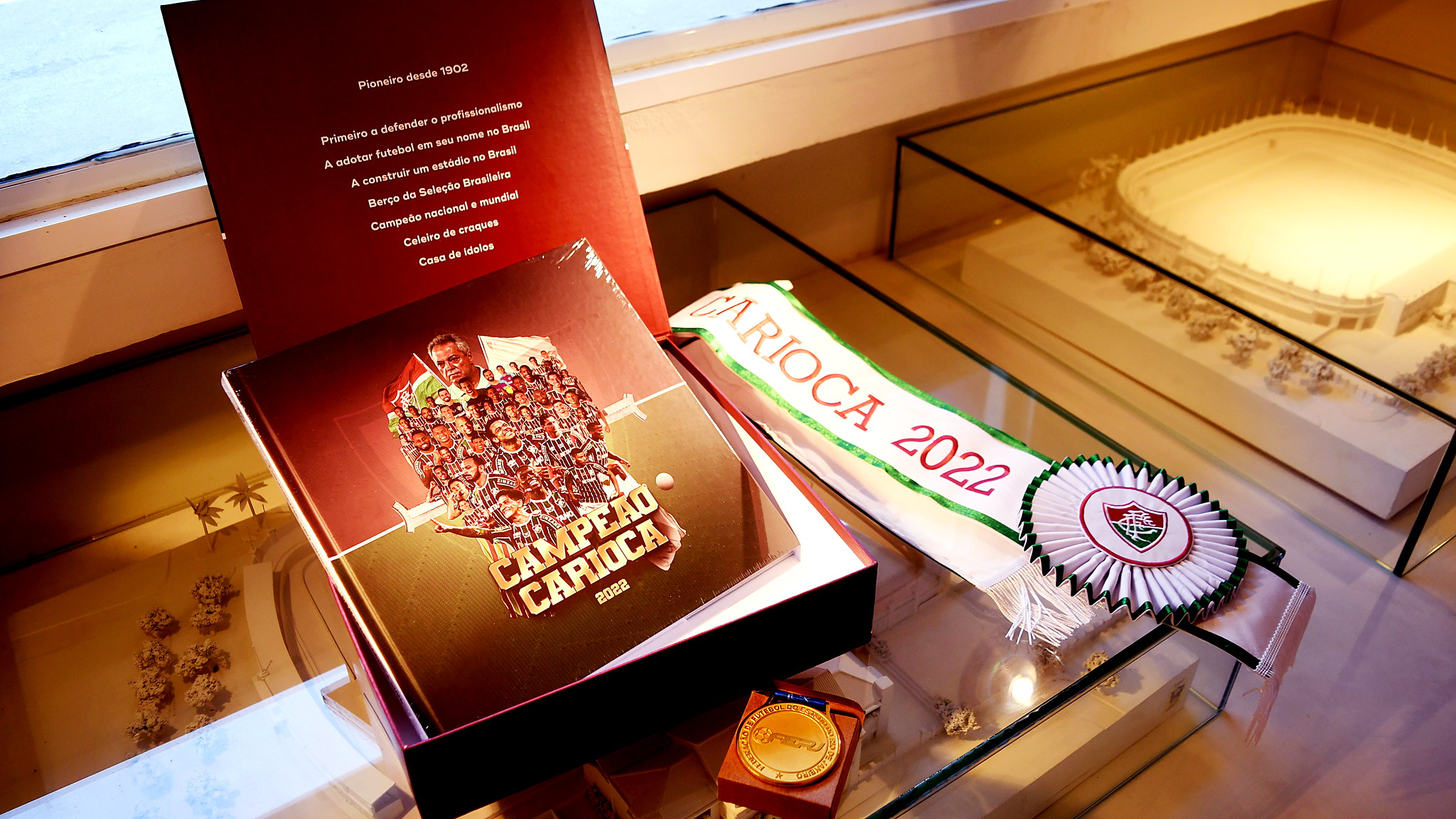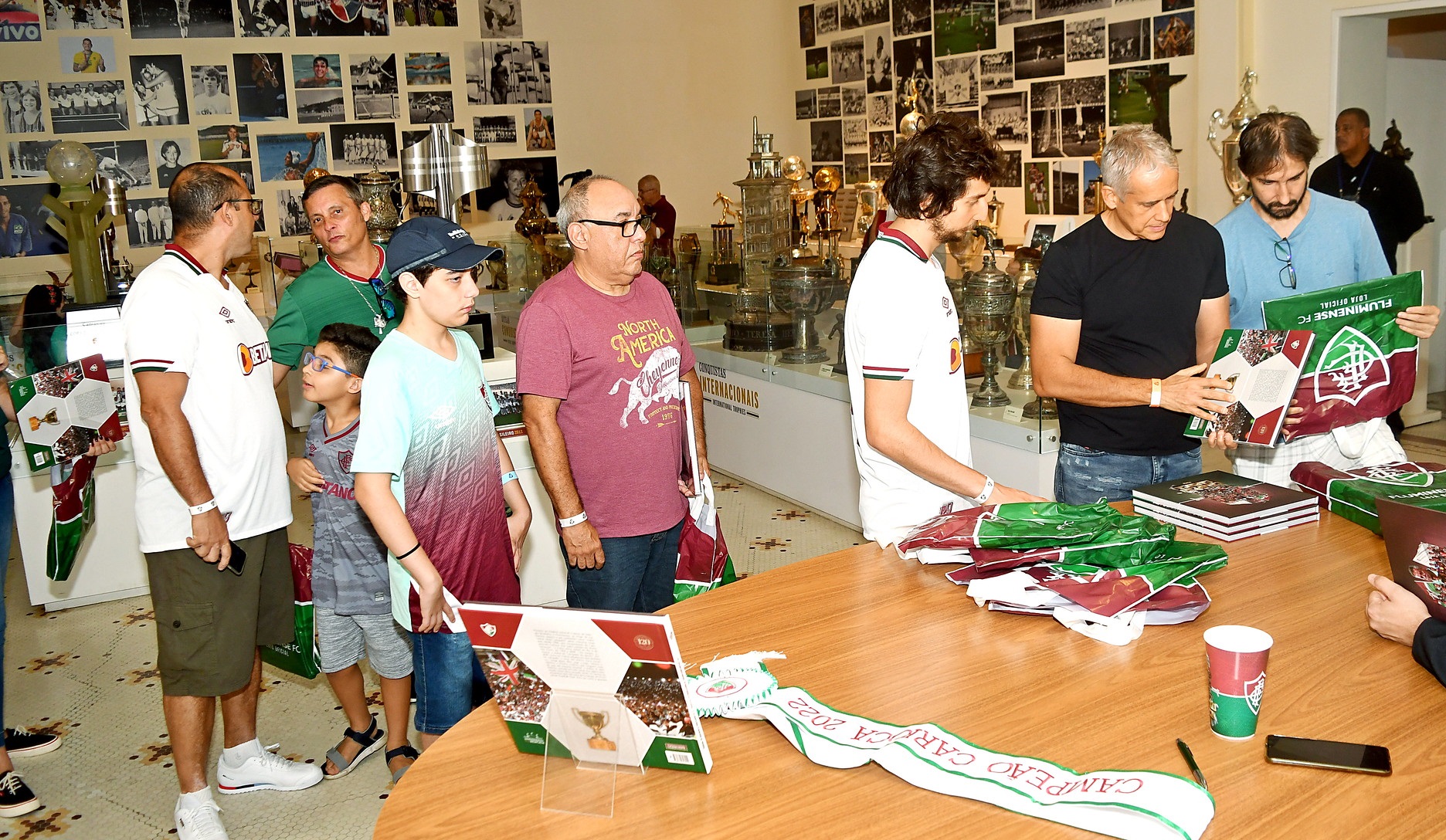 O Fluminense realizou neste sábado (22/10), na Sala de Troféus da sede de Laranjeiras, o lançamento oficial do livro "Campeão Carioca 2022", assinado por Dhaniel Cohen. A cerimônia reuniu exclusivamente convidados e contribuintes do crowdfunding "Fluminense, Eterno Campeão!", promovido pelo clube no último mês e destinado à arrecadação de recursos para melhorias no Centro de Treinamento Carlos Castilho. Foram arrecadados mais de R$ 80 mil.A obra de 132 páginas conta as histórias do título, reúne imagens exclusivas e apresenta textos inéditos de Abel Braga, Germán Cano e Fred.Em tiragem limitada, o livro, produzido em papel couchê 170g, possui formato quadrado (28cm x 28cm) e capa dura. Quem compareceu ao evento, pôde adquirir por R$ 150 os exemplares ainda disponíveis ao fim do crowdfunding (arrecadação de recursos de forma coletiva).Entre as recompensas do financiamento coletivo, os torcedores puderam garantir, ainda, a faixa de campeão e a medalha oficial (com certificado de autenticidade), além de uma camisa autografada pelo elenco tricolor.Texto: Comunicação/FFCFotos: Leonardo Brasil e Mailson Santana/FFC
