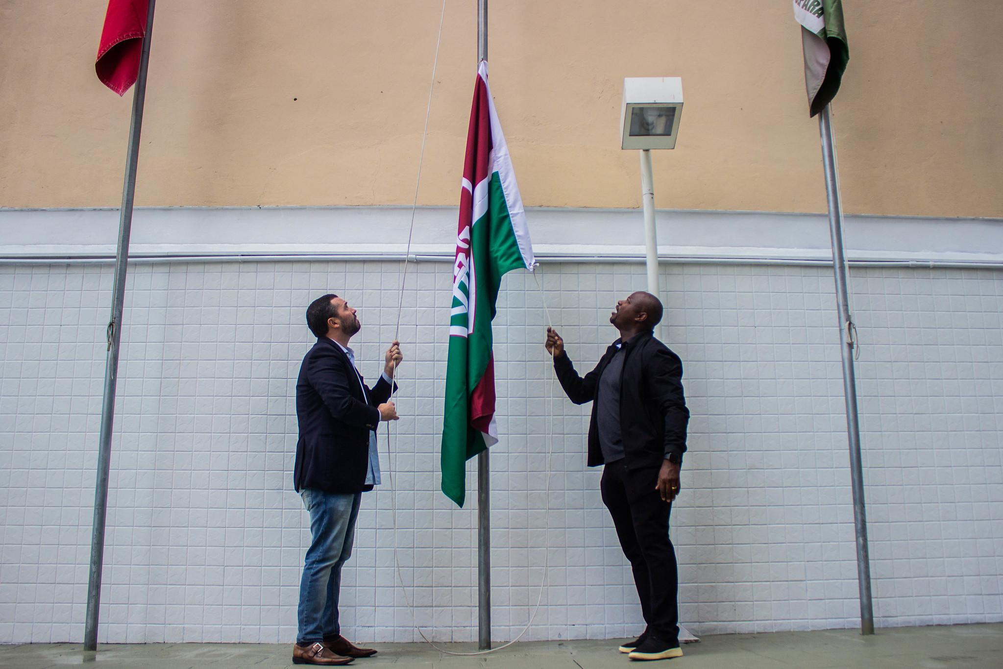 Em cerimônia realizada na manhã desta sexta-feira (10/06), a bandeira do Fluminense foi hasteada na sede da Federação de Futebol do Estado do Rio (Ferj) como forma de homenagem pelo título do Campeonato Carioca, conquistado pelo Tricolor no início de abril em decisão contra o Flamengo. O presidente Mário Bittencourt e o auxiliar-técnico Marcão estiveram presentes e falaram sobre a importância do evento.“Durante 25 anos da minha vida morei bem pertinho aqui do Maracanã. Eu ia para o estádio a pé e nem no meu maior sonho de criança eu poderia imaginar que um dia fosse hastear a bandeira do Fluminense como campeão carioca do lado do Maracanã. Muito bacana poder viver esse momento e muito bacana poder voltar a botar essa bandeira aqui depois de dez anos. O Campeonato Carioca é muito importante para nós, para a história do clube. Temos conquistas memoráveis, como o gol de barriga do Renato (Gaúcho), os gols do Assis na década de 80. Eu acho que esse campeonato de 2022 também tem momentos marcantes. Foram dois grandes jogos contra nosso maior rival, com três gols do Germán Cano, que surge como um novo ídolo da torcida. Nunca substituindo, mas com a proximidade da aposentaria do Fred, poder ganhar um Carioca com gols do centroavante que o clube trouxe acho que traz um enredo importante para essa conquista. O presidente Rubes (Lopes, da Ferj) disse que eu dei um nó muito forte na cordinha da bandeira e eu disse que é para a gente ficar aqui por longos anos. Rumo ao bicampeonato”, declarou Mário.Após discursos do presidente tricolor e do presidente da Ferj, Rubens Lopes, a bandeira do campeão anterior foi descerrada para dar lugar ao pavilhão tricolor, que seguirá tremulando até que o Estadual tenha um novo campeão. Durante o hasteamento da bandeira, o hino do Fluminense foi executado pela Banda do Batalhão de Guardas do Exército. Também estiveram presentes Marcelo Vianna, diretor de competições da Ferj, e Marcelo Penha, coordenador administrativo do Flu.“Importante firmar nosso espaço, mostrar que nossa equipe é forte, guerreira, valente. Nós mostramos isso durante o Campeonato Carioca todo e tenho certeza que virão muito mais coisas boas por aí, estamos trabalhando para isso, hoje com nosso professor Fernando Diniz. A equipe vem entregando tudo nos treinamentos e todo mundo tem visto os jogos. E com a ajuda do nosso torcedor o Fluminense fica muito forte. Espero que continuem acreditando, chegando junto desses guerreiros, pois tenho certeza que vão busca mais este ano. É um prazer estar aqui, foi um campeonato em excelência”, disse Marcão.Fotos: Marina Garcia/FFCTexto: Comunicação/FFC