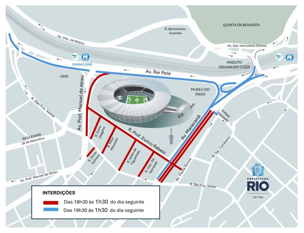 – Rua Professor Eurico Rabelo;– Rua Artur Menezes;– Rua Conselheiro Olegário;– Rua Isidro de Figueiredo;– Rua Visconde de Itamarati, entre a rua São Francisco Xavier e a avenida Professor Eurico Rabelo;– Avenida Maracanã, pistas sentido Centro, a Rua São Francisco Xavier e a Rua Mata Machado– Avenida Rei Pelé, duas faixas no sentido Centro, a partir da avenida Professor Manoel de Abreu até a altura do Museu do Índio;– Viaduto Oduvaldo Cozzi e seus acessos;– Rua Mata Machado, entre a avenida Paula Sousa e a avenida Maracanã;– Avenida Professor Manoel de Abreu, no sentido Centro, entre a rua São Francisco Xavier e a avenida Rei Pelé;Das 19h30 até 01h30 do dia seguinte