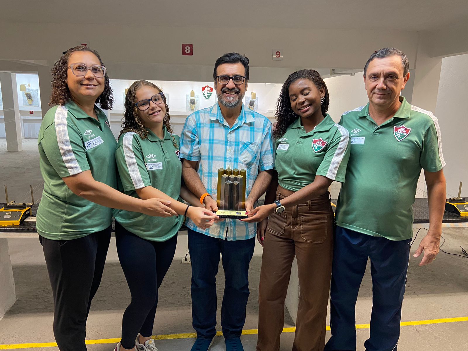 A equipe feminina de tiro esportivo do Fluminense recebeu na sexta-feira (17/03) o Prêmio Clube Formador, oferecido pelo Comitê Brasileiro de Clubes pelo seu desempenho na temporada 2021/2022, quando liderou o ranking nacional. O troféu foi entregue pelo vice-presidente de Esportes Olímpicos do Fluminense, Márcio Trindade, ao técnico tricolor Renato Agonigi em cerimônia realizada no estande de tiro do clube, na sede de Laranjeiras. Também estiverem presentes o diretor do Departamento de Esportes Olímpicos, João Mandarino, e o técnico de tiro esportivo, Sérgio Meinicke.