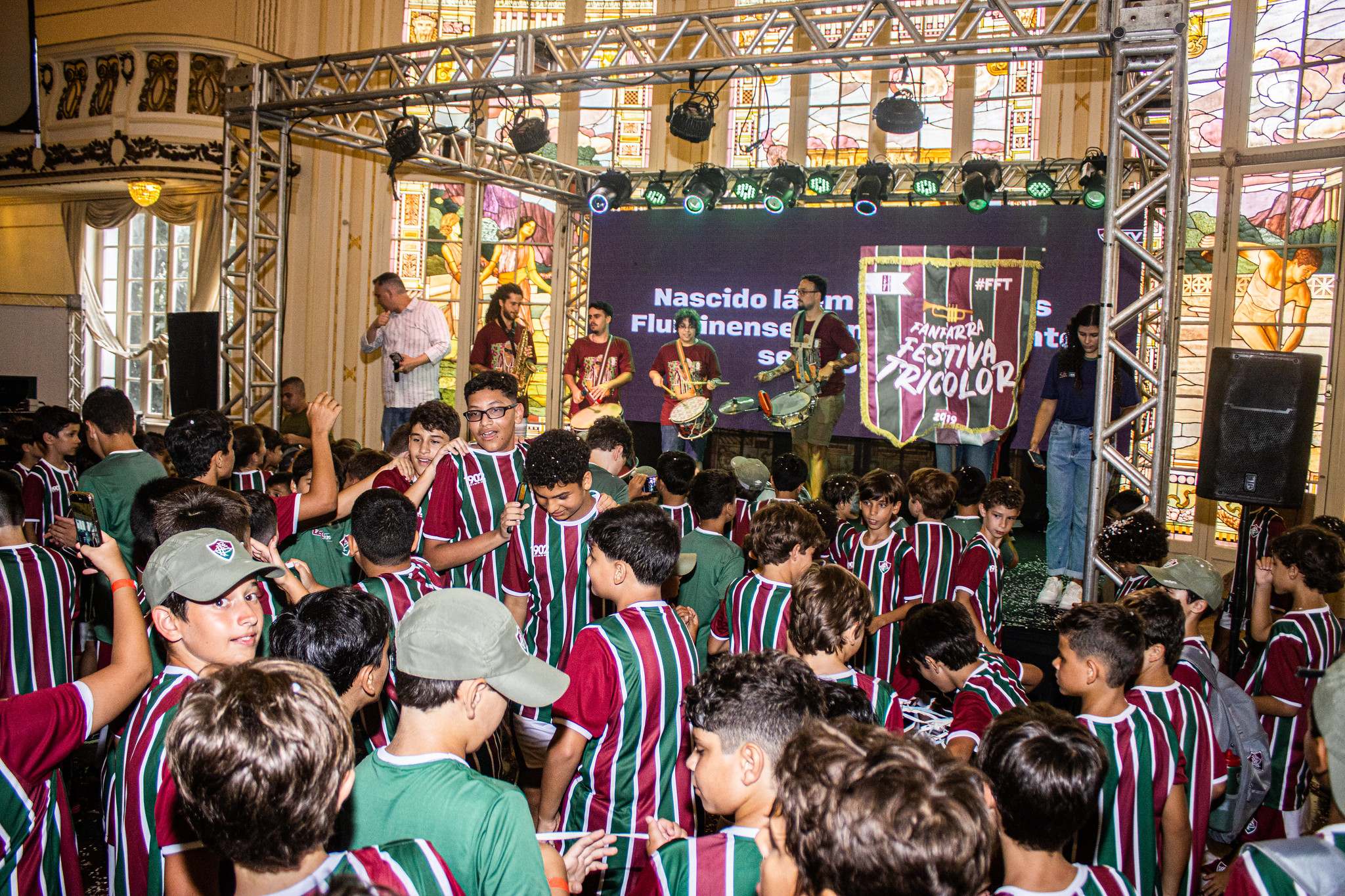 Após o almoço, o Salão Nobre voltou a ser o palco principal do evento. Com confete e serpentina para todo lado, a Fanfarra Festiva Tricolor fez os alunos tirarem o pé do chão. Sem deixar a energia cair, foi a vez do Fut Paródias empolgar a garotada.