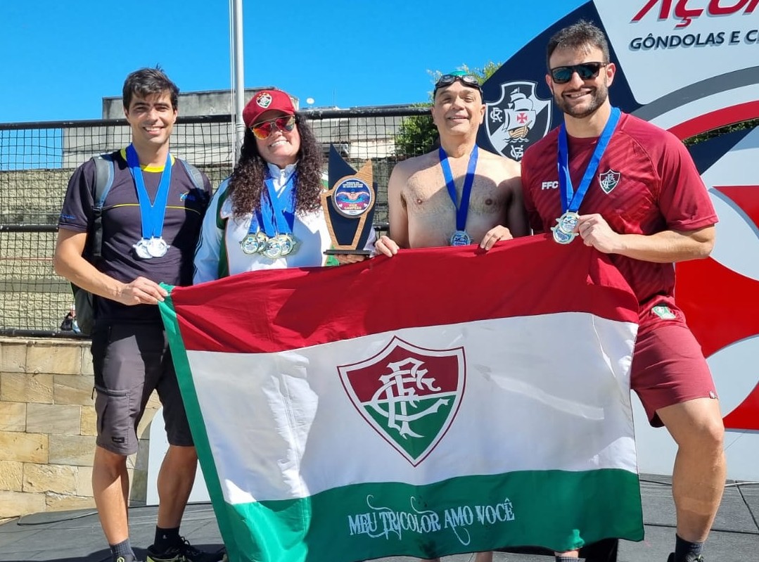 O Fluminense ficou com o segundo lugar na 8ª Etapa do Circuito Master de Natação, realizado no sábado (25/10), no parque aquático do Vasco da Gama. O Tricolor conquistou 39 medalhas e somou 1068 pontos na tabela.Durante a competição, o Tricolor obteve 34 medalhas de ouro, quatro pratas e um bronze. A delegação do Fluminense teve 14 representantes na 8ª etapa da competição.Confira todos os atletas do Fluminense na 8ª etapa do Circuito Master de Natação:Cláudia Barroso MachadoMaylu de Cerqueira Lima da RochaDeboura de Moura CalileStella Francisco Osório BertasoAna Maria Lopes MoreiraSaul BirmanFernando Penna BottoLais Sampaio AlmeidaMatheus Novello FaveroSidney S. CalderoniMarcello Jorge Carrapito MoreiraRicardo Griese BrunetFelipe Tannus DóreaJosé Carlos Fernandes da CostaAtleta tricolor conquista bons resultados em campeonato de apneiaA atleta Luciana Victor Noronha participou do 10º campeonato Brasil Aida de Apneia Indoor, em Ubatuba-SP, e obteve bons resultados no módulo feminino. A nadadora conquistou os títulos geral e na categoria STA, além de ficar com o segundo lugar nas categorias DNF e DYNB.Texto: Comunicação/FFCFoto: Arquivo Pessoal