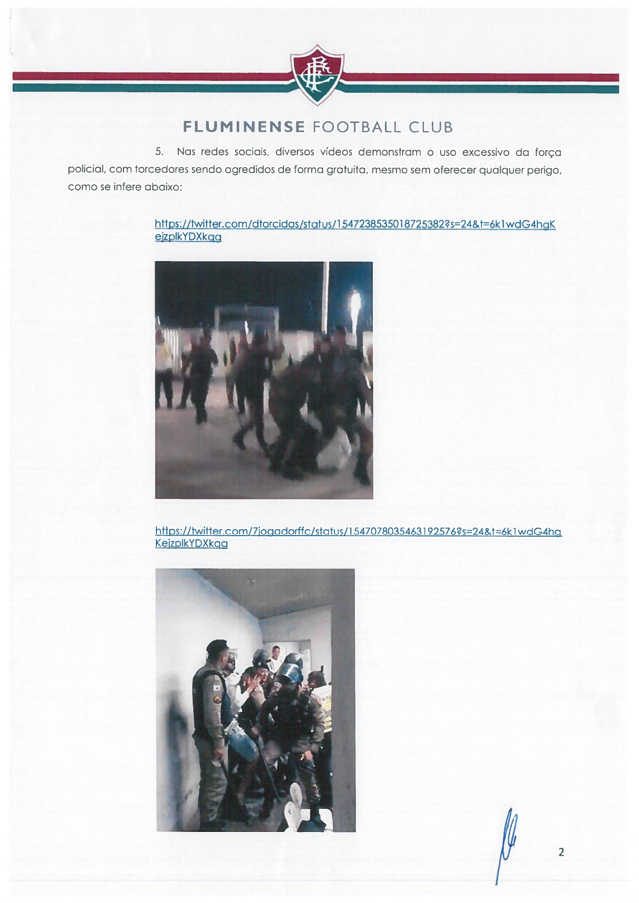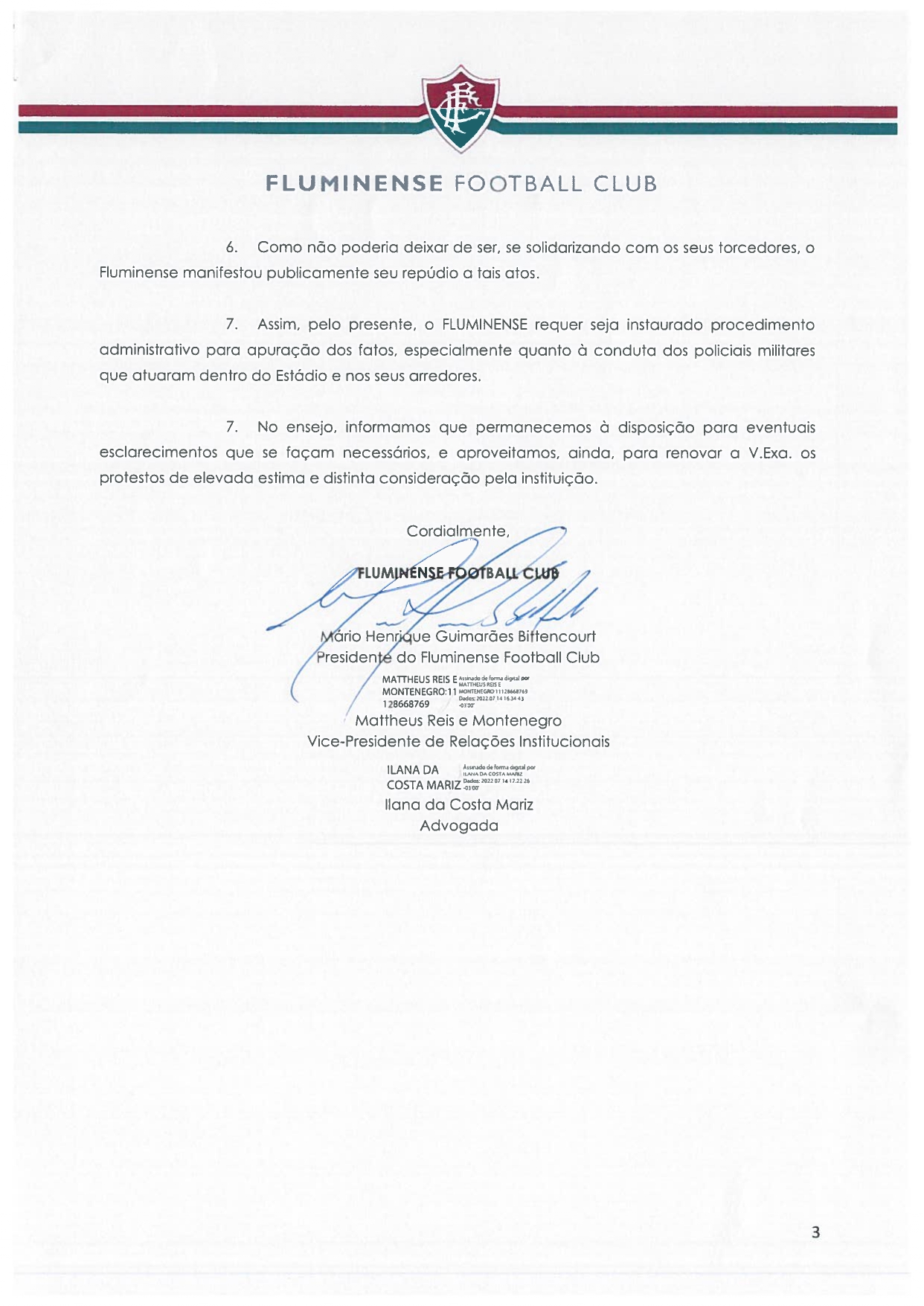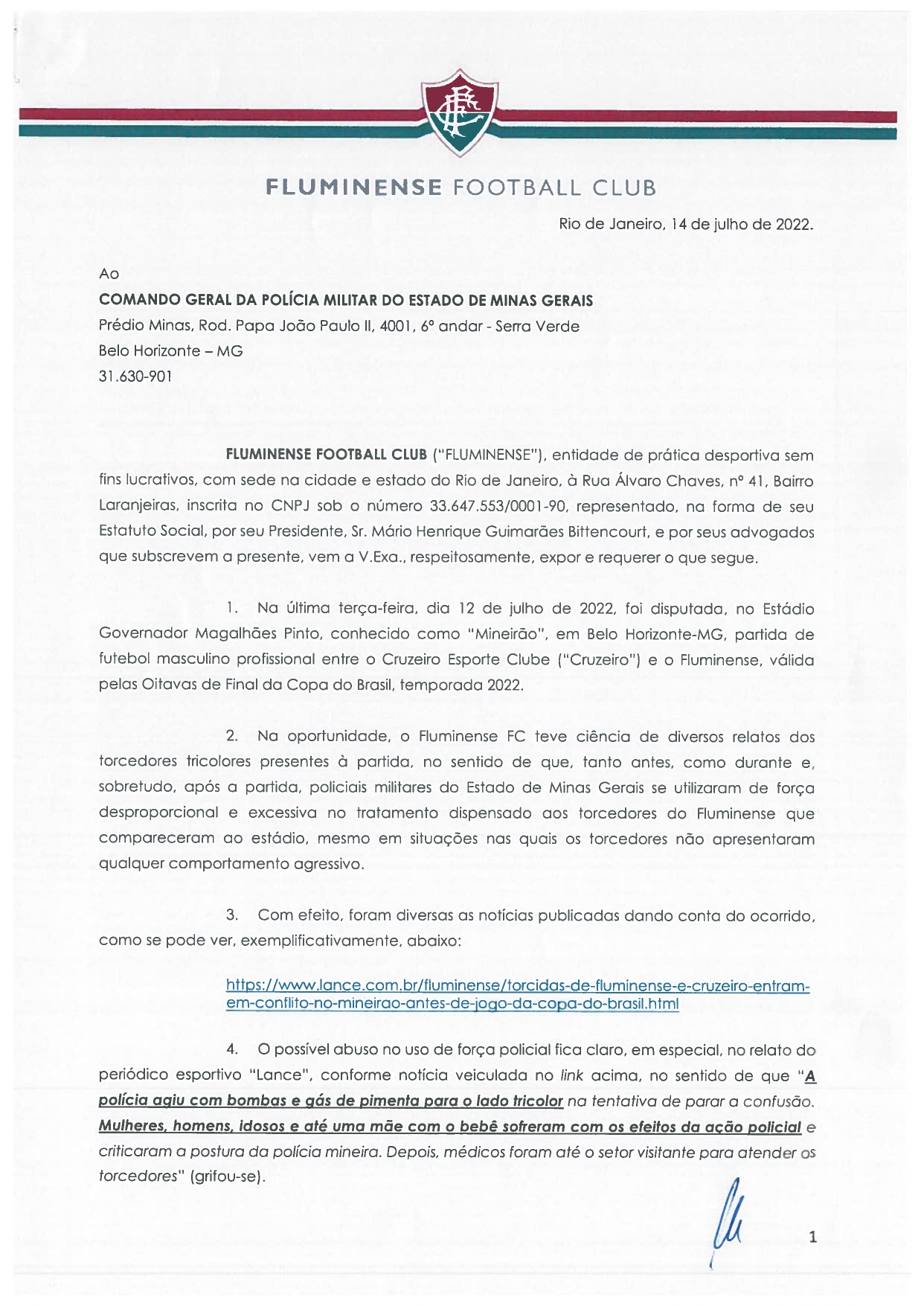 O Fluminense encaminhou, na manhã desta sexta-feira (15/07), ofício para o Comando Geral da Polícia Militar do Estado de Minas Gerais solicitando a apuração da conduta de policiais com torcedores do clube na partida da última terça-feira (12/07), contra o Cruzeiro, no Mineirão, pela Copa do Brasil.No documento, o Fluminense relata que os policiais “se utilizaram de força desproporcional e excessiva no tratamento dispensado aos torcedores do Fluminense que compareceram ao estádio, mesmo em situações nas quais os torcedores não apresentaram qualquer comportamento agressivo”.O Fluminense encaminhou ainda links de matérias publicadas na imprensa e diversas imagens que circularam nas redes sociais mostrando o comportamento dos agentes.O clube conclui o ofício demonstrando o respeito à instituição mineira e lembrando que, em defesa dos seus torcedores, manifestou publicamente repúdio aos atos cometidos por alguns policiais presentes à partida e se colocou “à disposição para eventuais esclarecimentos que se façam necessários”.
