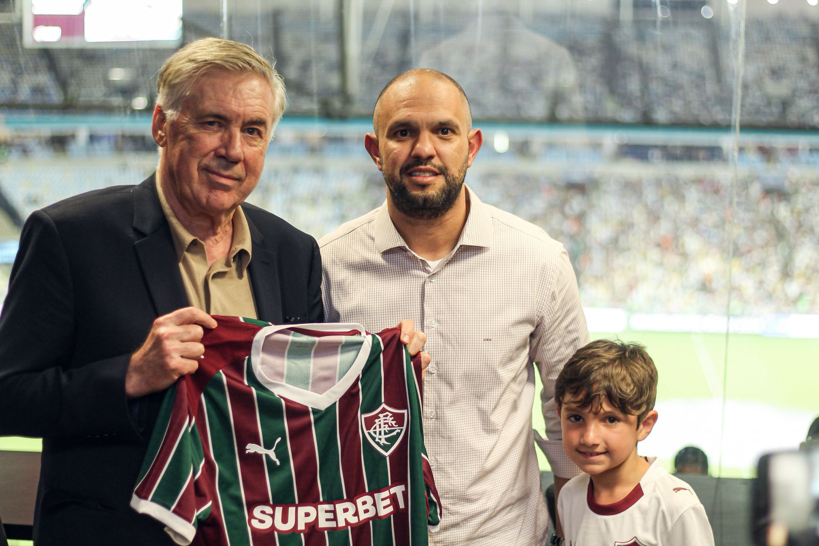 O presidente Mattheus Montenegro recebeu o técnico da Seleção Brasileira, Carlo Ancelotti, na noite desta quarta-feira (28/01), no Maracanã. O treinador italiano esteve no estádio para acompanhar a estreia do Fluminense no Campeonato Brasileiro, contra o Grêmio.Acompanhado do diretor-geral, Mário Bittencourt, Montenegro deu as boas-vindas ao técnico da Seleção e o presenteou com uma camisa do Fluminense personalizada com seu nome. O encontro aconteceu durante o intervalo da partida, na cabine onde Ancelotti assistiu à vitória tricolor por 2 a 1. Também esteve presente o coordenador de Seleções Masculinas da CBF, Rodrigo Caetano.Fotos: Leonardo Brasil/FFCTexto: Comunicação/FFC