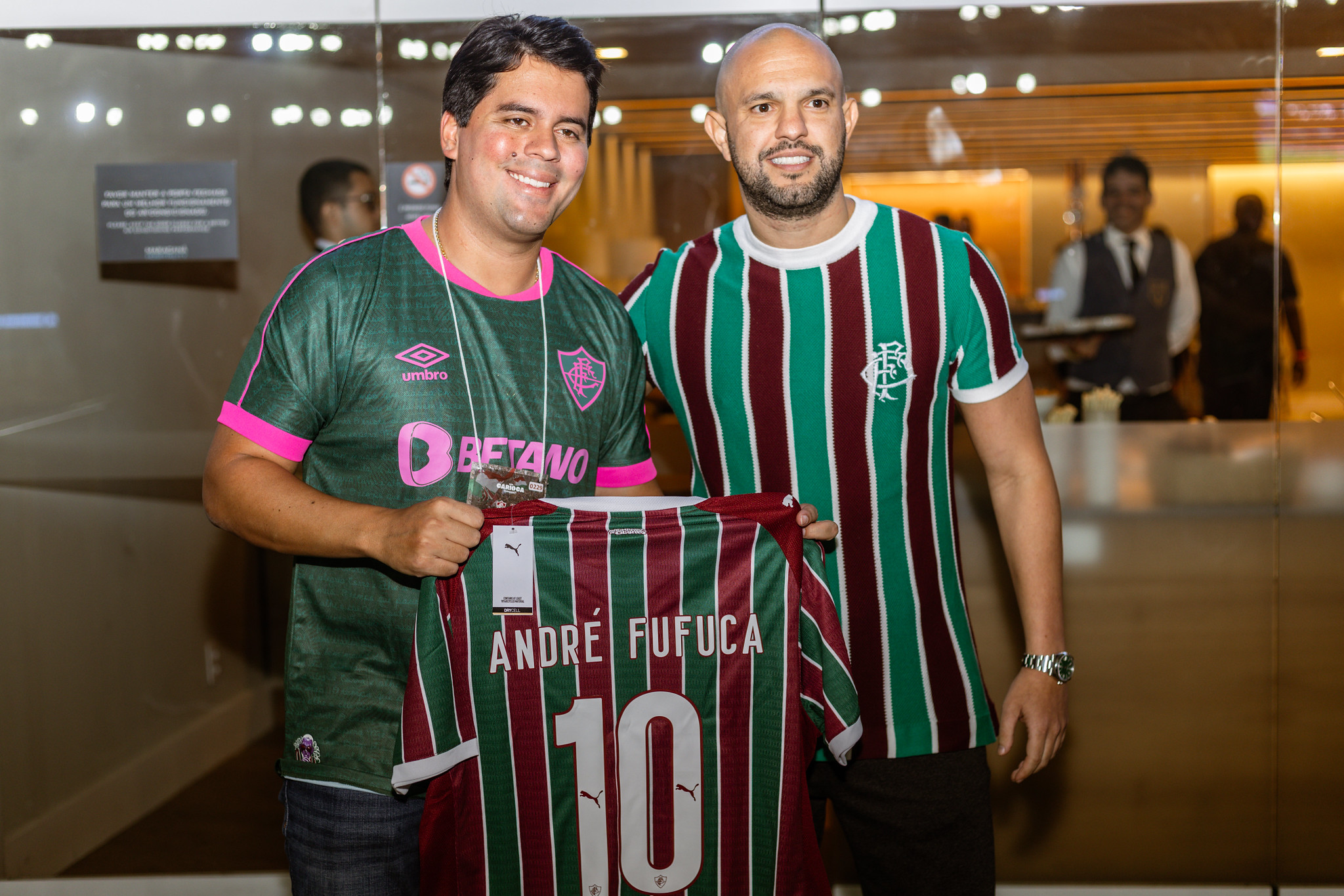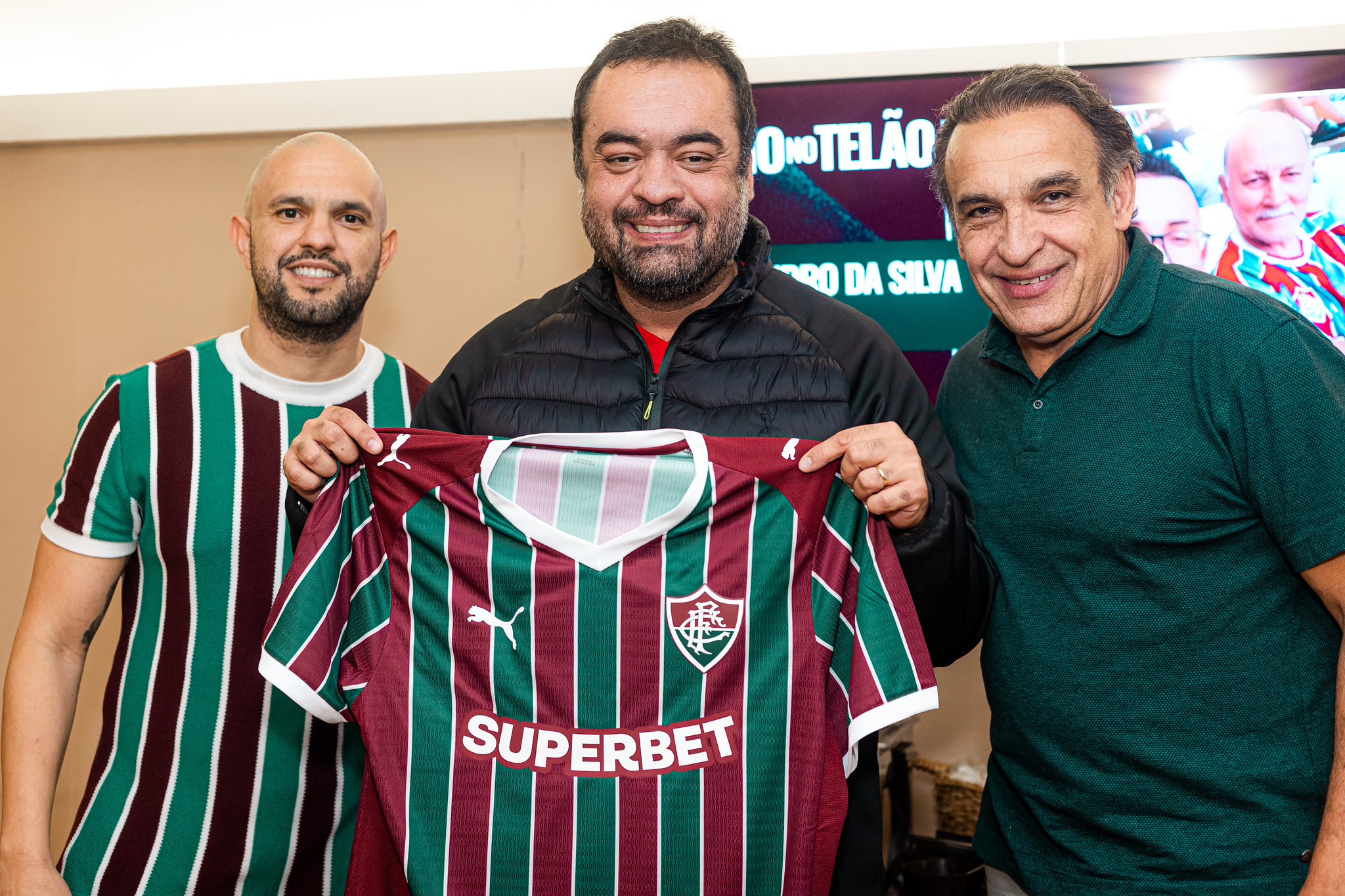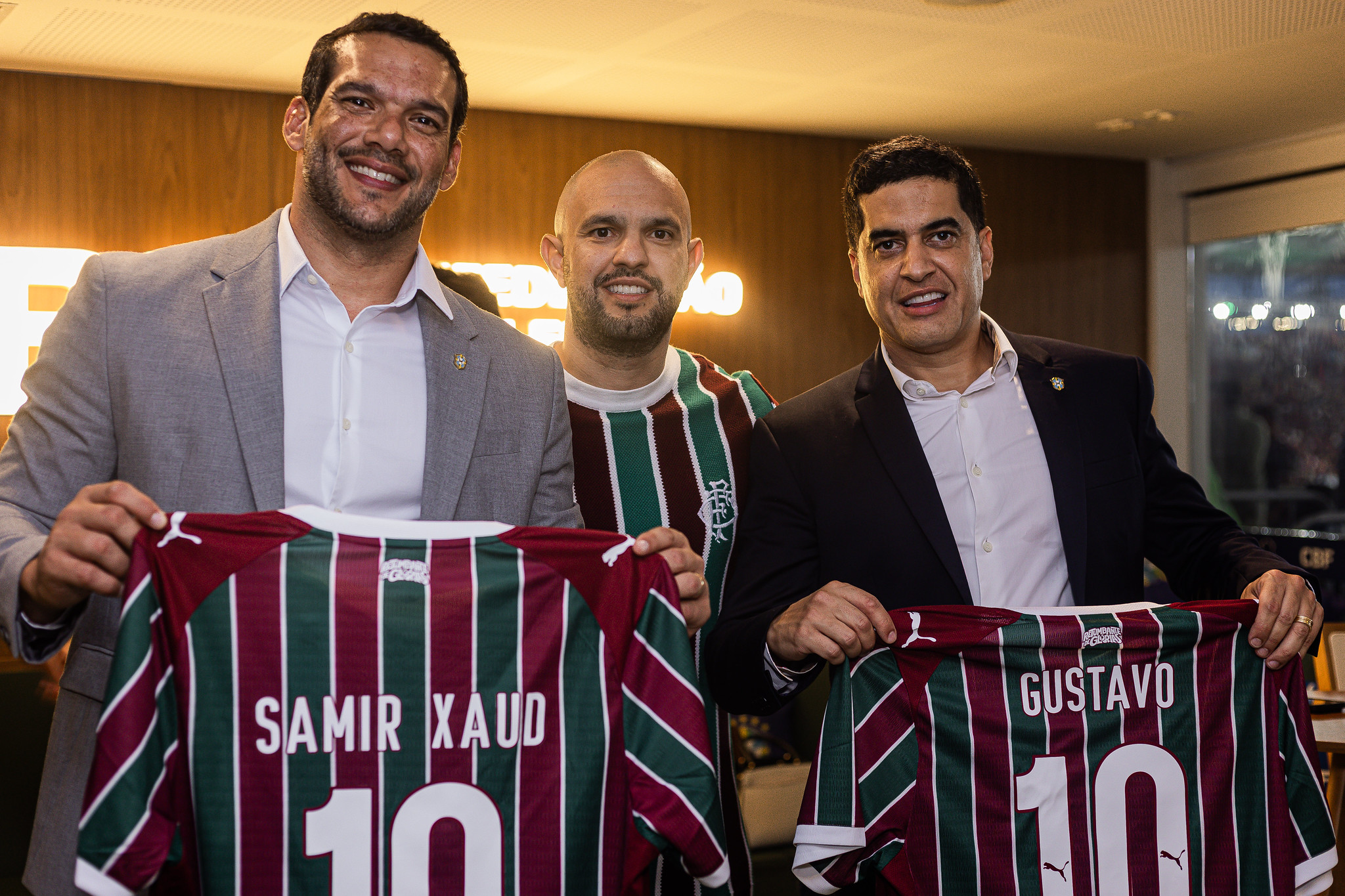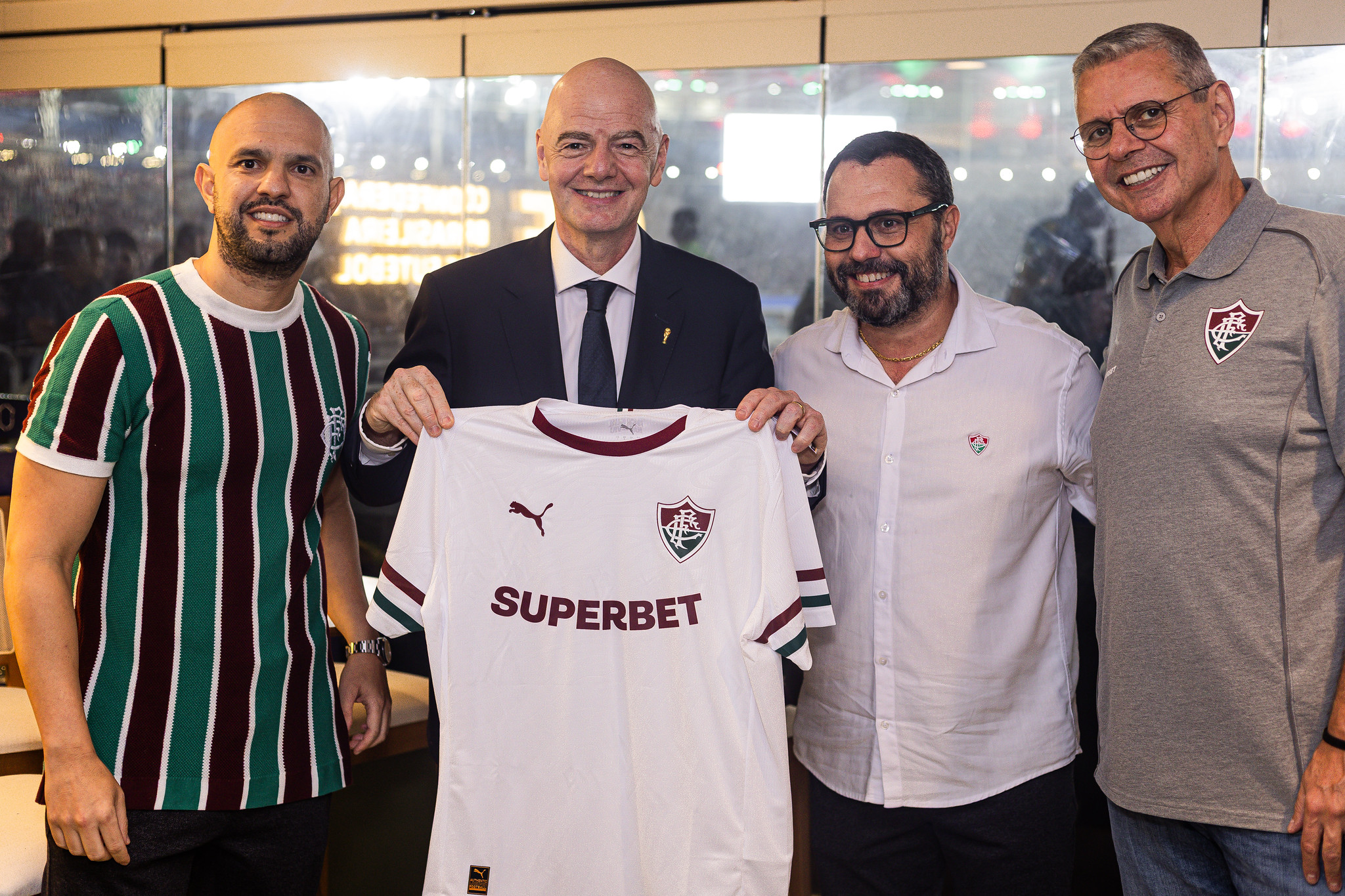 O presidente do Fluminense, Mattheus Montenegro, o vice-presidente, Ricardo Tenório, e o diretor-geral do clube, Mário Bittencourt, se encontraram com os presidentes da FIFA, Gianni Infantino, e da CBF, Samir Xaud, neste domingo (25/01), no Maracanã. Os dirigentes das entidades máximas do futebol mundial e brasileiro foram presenteados com camisas do Tricolor personalizadas com seus nomes.Infantino e Xaud acompanharam a vitória do Fluminense por 2 a 1 sobre o Flamengo, em clássico válido pelo Campeonato Carioca. O vice-presidente da CBF, Gustavo Dias Henrique, participou do encontro.Gianni Infantino esteve no Maracanã em evento da FIFA que homenageou brasileiros campeões do mundo com a Seleção, em ação de promoção da Copa do Mundo Feminina de 2027. O estádio receberá a partida de abertura e a final do torneio.A diretoria tricolor se encontrou ainda com o ministro do Esporte, André Fufuca, e o governador do Rio de Janeiro, Cláudio Castro. O diretor-geral da PUMA na América Latina, Carlos Laje, também esteve presente ao Fla-Flu deste domingo.Fotos: Marina Garcia/FFCTexto: Comunicação/FFC