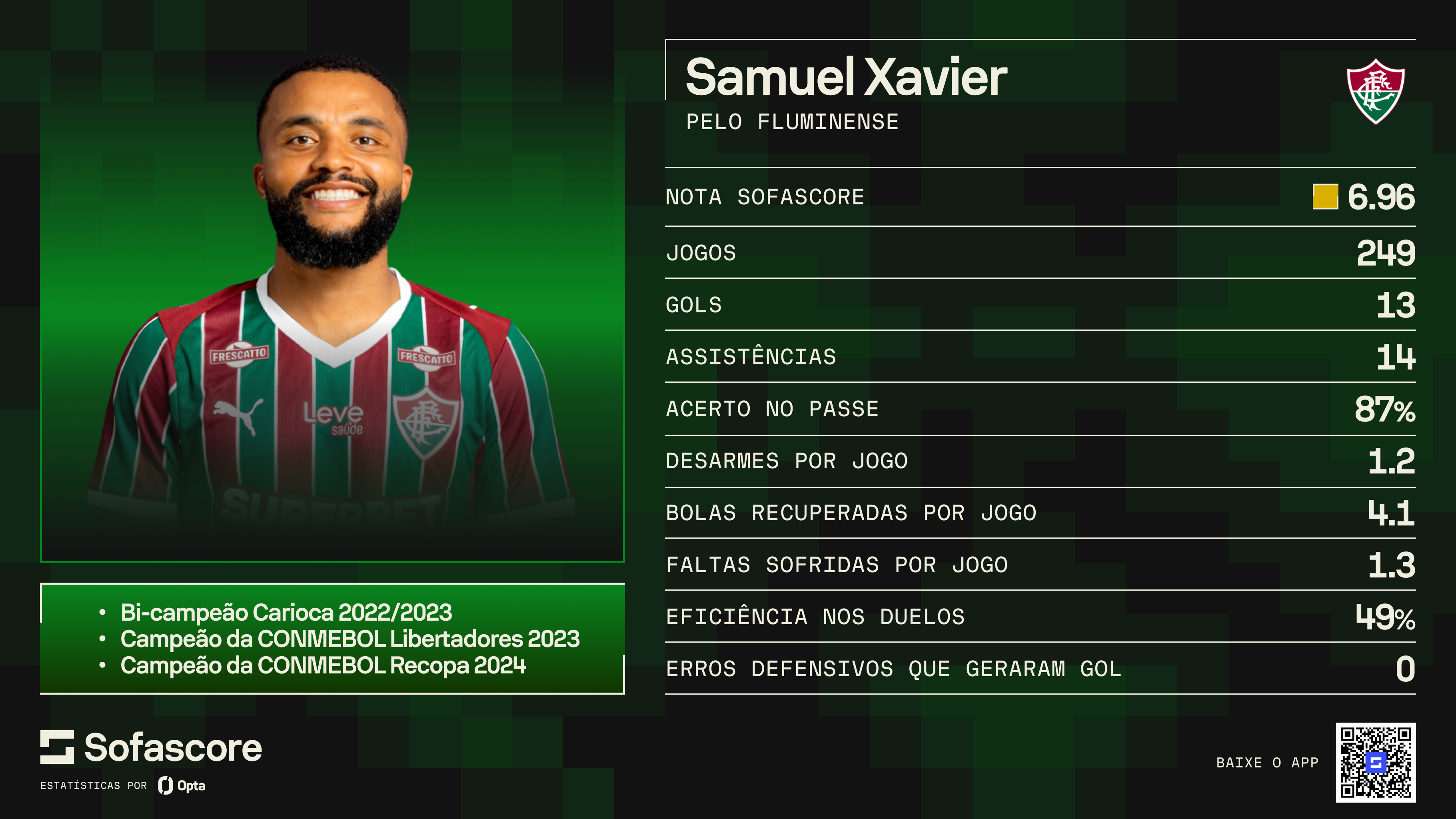 Titular na partida contra o Grêmio, Samuel Xavier vai completar 250 jogos pelo Fluminense nesta quarta-feira (28/01). Antes da entrada para o aquecimento, o lateral foi homenageado com uma camisa com o número referente à marca das mãos do presidente Mattheus Montenegro.No Fluminense desde 2021, Samuel Xavier é o décimo jogador com mais partidas pelo Tricolor no século XXI, atrás apenas de Martinelli, PH Ganso e Fábio entre atletas do atual elenco. O lateral foi peça fundamental nas campanhas dos títulos da Conmebol Libertadores, Conmebol Recopa e dos Campeonatos Cariocas de 2022 e 2023.Segundo dados do SofaScore, Samuel disputou 249 jogos desde que chegou ao Fluminense, sendo 234 como titular, marcou 13 gols e deu 13 assistências. O lateral acumula 87% de acerto de passe, 1.2 desarmes e 4.1 bolas recuperadas por jogo, além de 49% de eficiência nos duelos com a camisa tricolor.Com Samuel Xavier no time titular, o Fluminense enfrenta o Grêmio nesta quarta-feira (28/01), às 19h30, em jogo válido pela primeira rodada do Campeonato Brasileiro.Texto: Comunicação/FFCFoto: Lucas Merçon/FFC