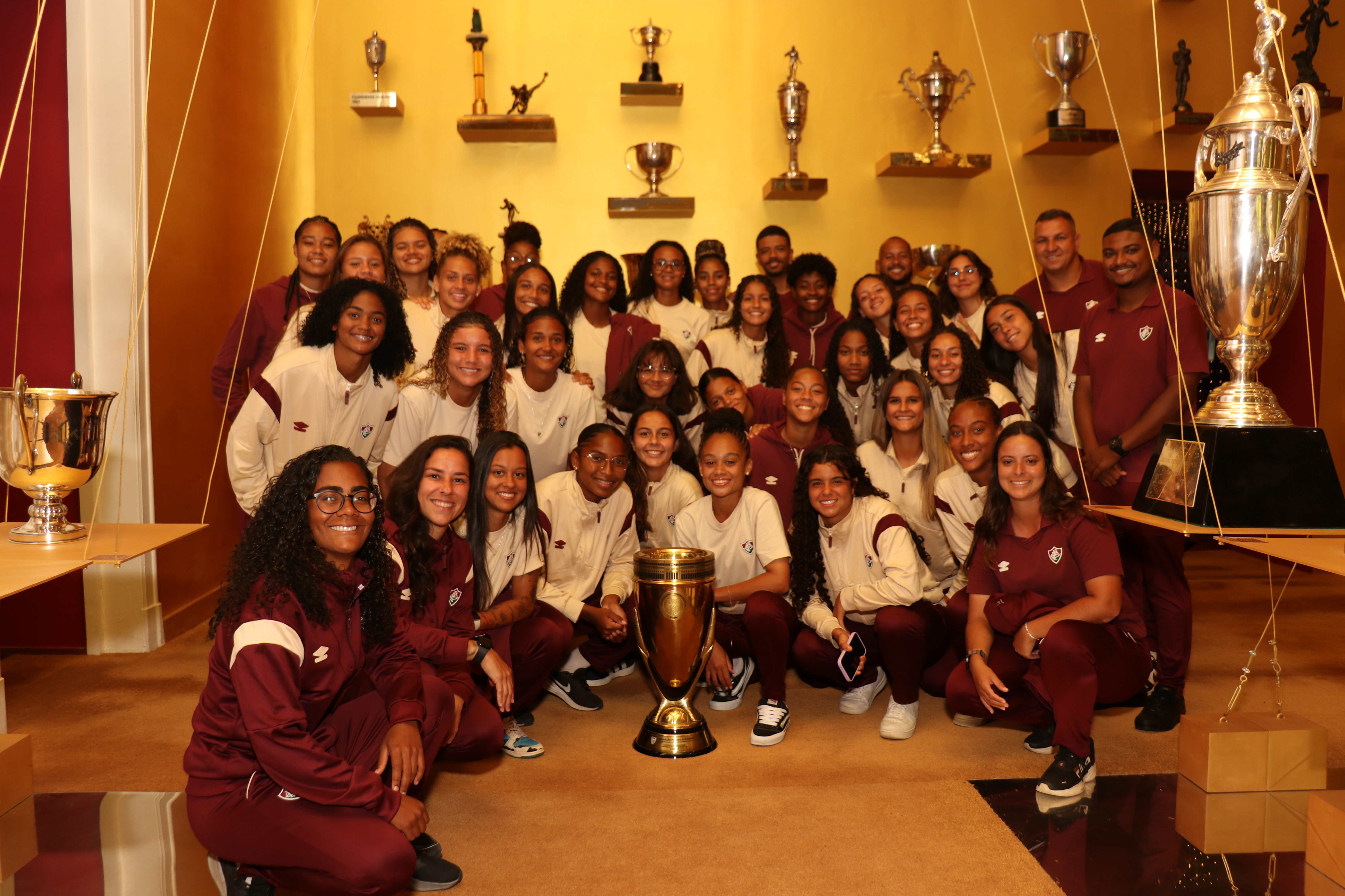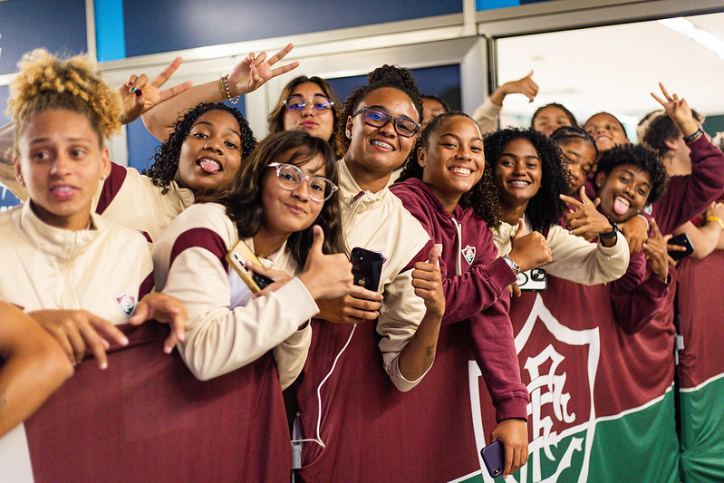 A uma semana da estreia na Copinha Feminina, o elenco Sub-20 viveu um dia de imersão tricolor em Laranjeiras e no Maracanã. A equipe da técnica Bárbara Saar visitou o Museu Fluminense, na sede do clube, e participou da clássica experiência do Matchday antes da goleada sobre o São Paulo, pela 36ª rodada do Campeonato Brasileiro.Primeiro, as atletas e comissão técnica fizeram uma tour no museu, onde puderam conhecer a fundo a história do Tricolor na sala "Nós somos a história". As Meninas de Xerém estiveram no Museu pela última vez no início deste ano, quando colocaram a taça da Copinha na sala de troféus, que foi a estrela da visita.Bárbara, treinadora que chegou no clube após a conquista, falou sobre como experiências assim incentivam a equipe, principalmente as estreantes na Copinha, a buscarem o bicampeonato.“Para a gente é muito importante essa visita ao museu, conhecer um pouco mais da história do Fluminense, trazer as meninas para verem tudo o que já foi construído, não só por elas do futebol feminino, mas também na história grandiosa desse clube. É muito bom poder oportunizar às meninas que estão participando pela primeira vez verem o que significou a última conquista e saber o quanto elas podem e têm para crescer e conquistar. Acho que é uma inspiração muito importante para a gente, olhar para essa taça traz ainda mais vontade e dedicação para a gente buscar o bicampeonato”, declarou a comandante.Após o tour, foi dado início à segunda parte do dia, no Maracanã, onde as meninas conheceram o vestiário, gramado e recepcionaram os jogadores na chegada do time ao estádio, antes de acompanharem o show tricolor no campo, com a goleada sobre o São Paulo, e na arquibancada, dos mais de 30 mil torcedores presentes no confronto.